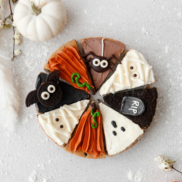 No cookie-related roundup is complete without a cookie cake! Go as creative as you wish when decorating this fun vegan Halloween cookie cake: go all out to give each slice a unique design, or keep it simple by doing a single design for the whole cake.