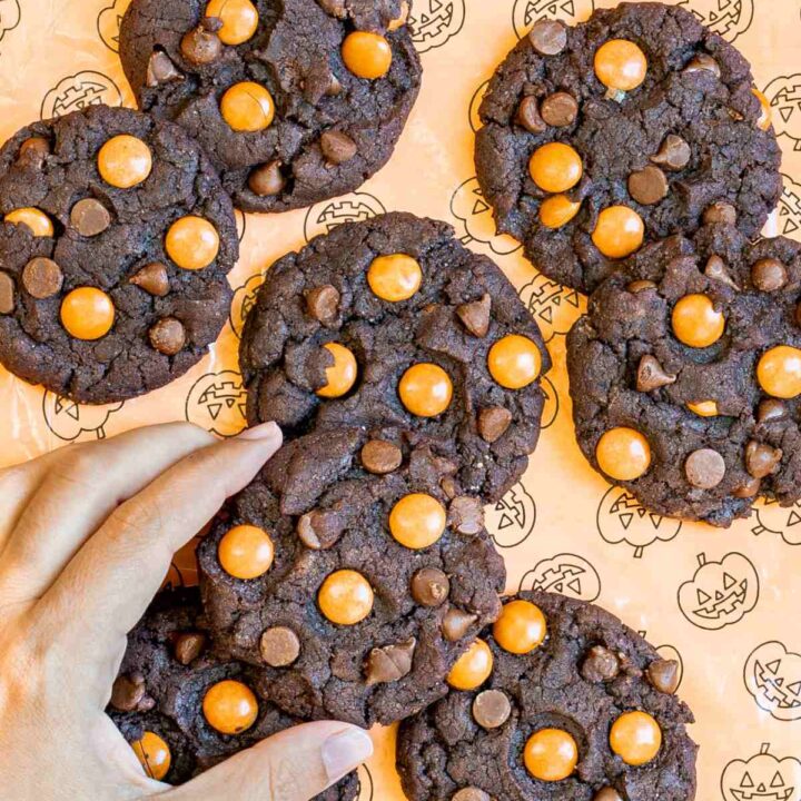 Another fun and easy vegan Halloween cookie idea. These soft and chewy chocolate chip cookies are decorated with orange Halloween M&M-style candy (see the recipe for vegan options). The extra dark color comes from Dutch-processed cocoa.