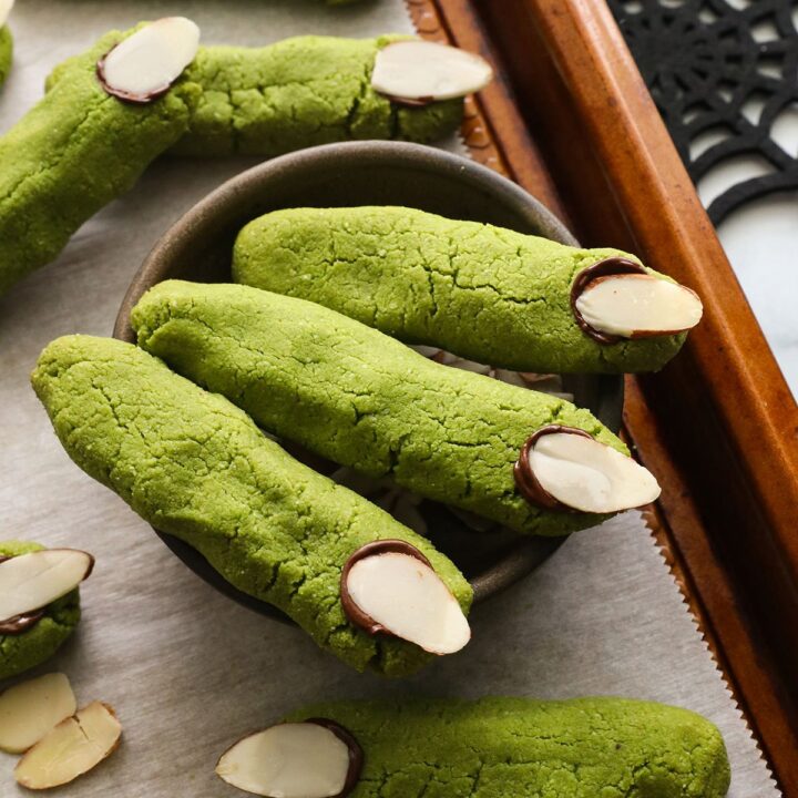 These spooky shortbread-based cookies will be a hit at any Halloween party! Matcha powder gives them a vibrant, green color, and pieces of sliced almonds are used as nails.