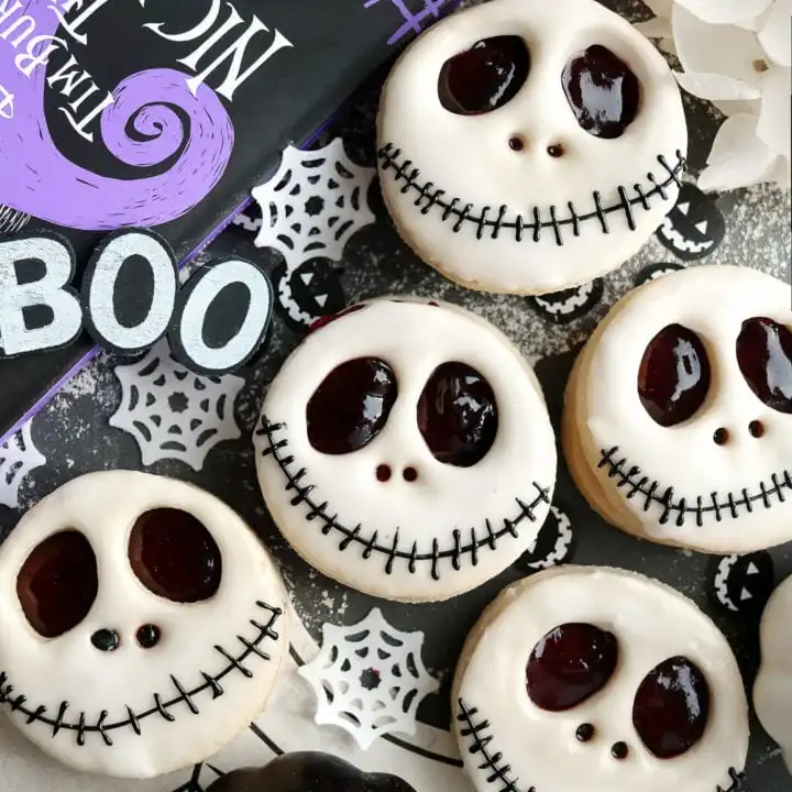 The king of Spookies - in a cookie form! These vegan Jack Skellingtons are made with two round sugar cookies glued together with cherry jam, and finished with a simple vanilla icing face.