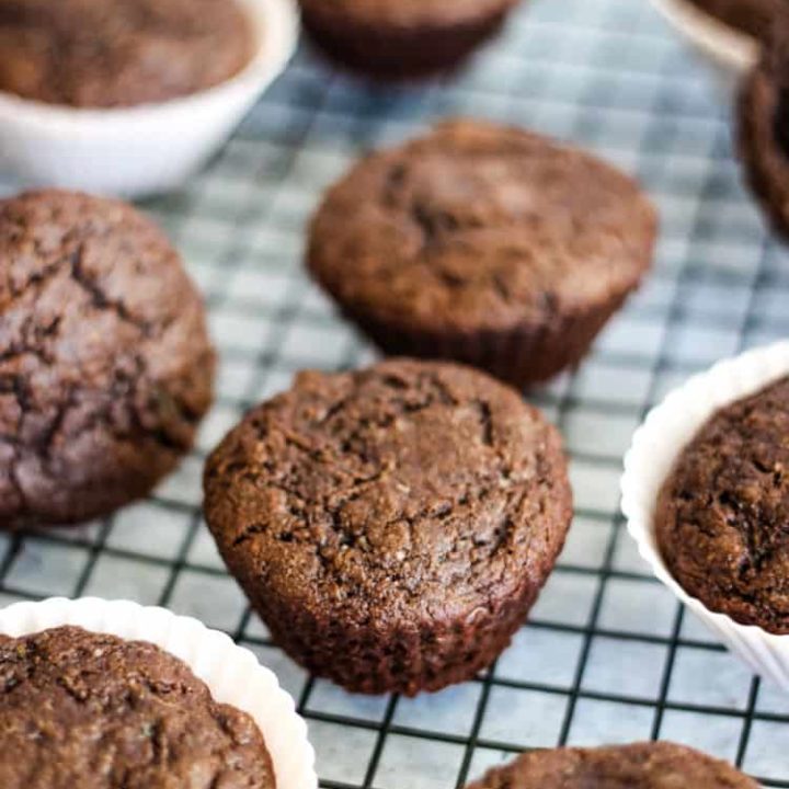 I don't think I need to sell you on chocolate muffins, and it's probably safe to think that you trust me that baby J loves these. In fact, our whole family is a fan: not only do these muffins taste heavenly, they are also quite healthy, made with no oil and hiding an entire grated zucchini in every batch (but you'd never tell that zucchini part, of course).
