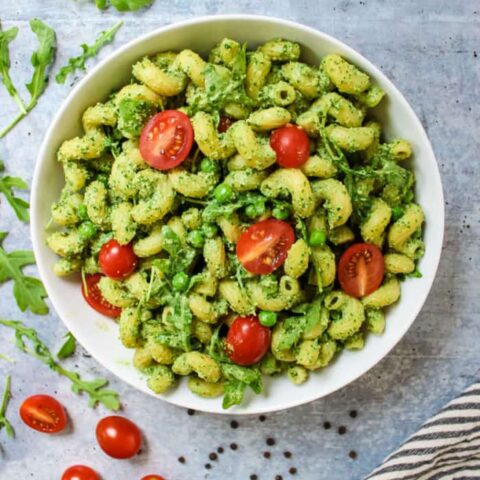 Baby J ate this pesto pasta salad even during her "picky eater" phase (honestly, does this phase really ever end? 😄). The kale and cashew pesto manages to get 2 green vegetables into this meal. Add arugula, and that number goes up to 3!