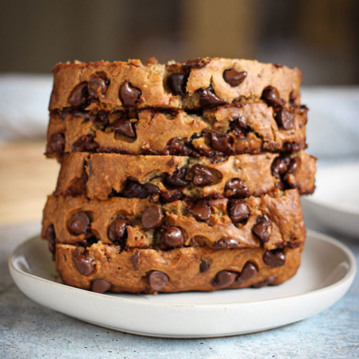 Baby J loves banana bread (I know, shocker! 😄), and this one is her favorite. Speckled with chocolate chips, it's got vibrant aroma and a rich, moist texture, yet it's made without any oil added!