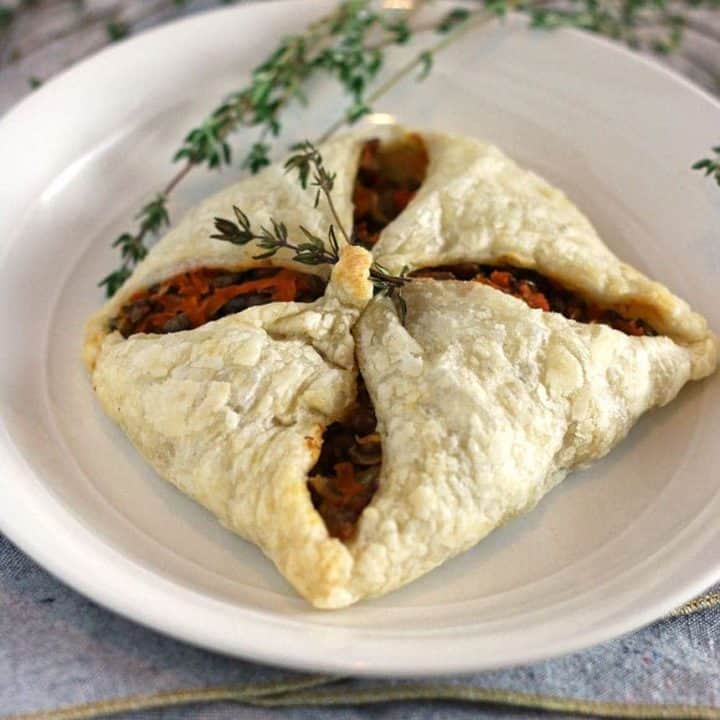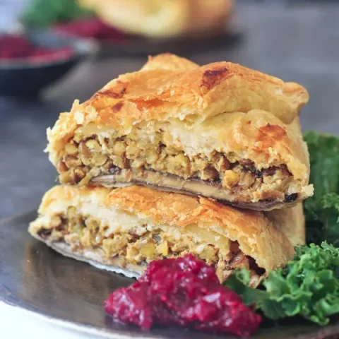 These lovely veggie-stuffed pockets are another option for puff pastry-wrapped vegan Christmas dinner centerpiece. Filled with wholesome lentils, carrots, and herbs, these pockets are easier to make than you'd think!