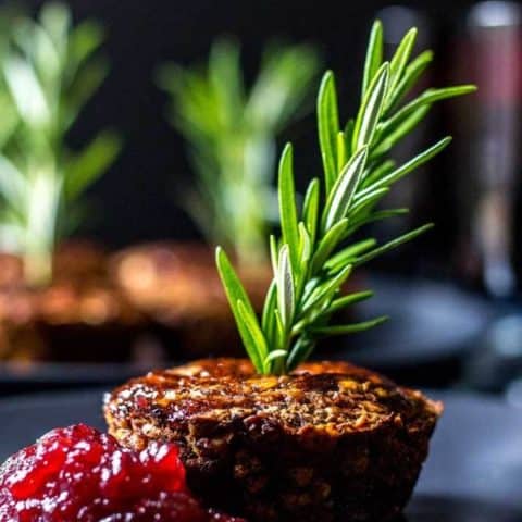 These personal-sized mini lentil loaves are made with mushrooms, lentils, oats and fresh sage. They make a satisfying vegan main course to serve with cranberry sauce at your Christmas dinner.