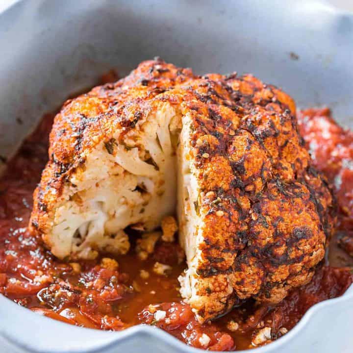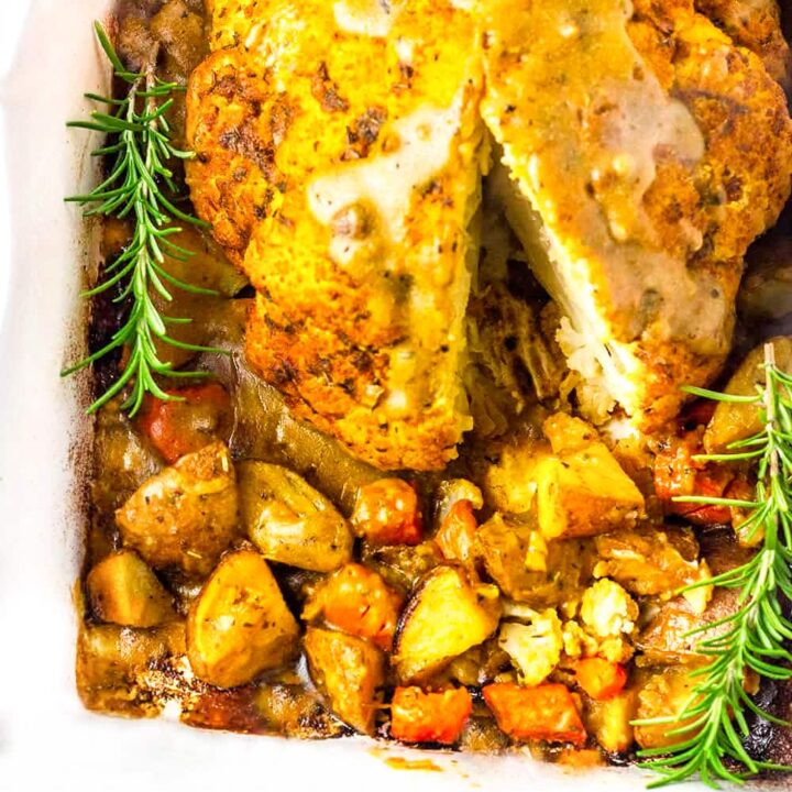 This gorgeous roasted cauliflower is baked with potatoes, carrots and herbs for a lightened-up yet delicious centerpiece of your vegan or vegetarian Christmas dinner.