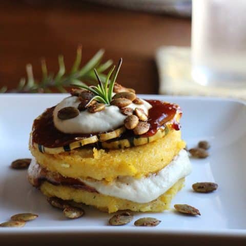 A festive personal-sized entree option for your vegan Christmas dinner. Homemade polenta circles are layered with BBQ sauce-glazed delicata squash and cashew cream, and topped with roasted pumpkin seeds.