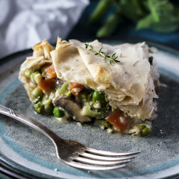 This vegan mushroom pot pie has a creamy, hearty filling topped with a flaky puff pastry crust. It makes delicious family-friendly holiday meal.