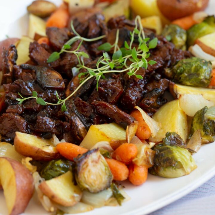 This "beefy" plant-based holiday pot roast is a hearty dish made with plant-based beefy tips or seitan, plus portobello mushrooms and plenty of vegetables. A fantastic option for holidays and special occasions.