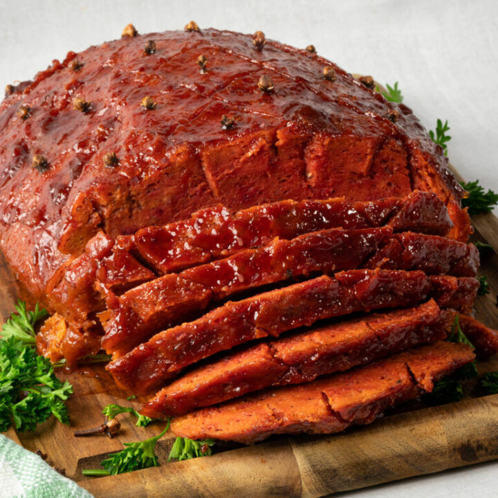 Can you believe this gorgeous glazed ham is vegan?! It's got a smoky, sweet, and satisfying flavor and a moist, meaty texture. A perfect holiday centerpiece or family dinner that will make great sandwiches later.