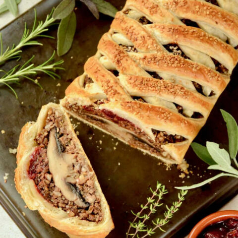 This vegan Wellington reveals a cut portobello mushroom in every slice. It has an umami rich nut-based filling, whole roasted portobello mushrooms and a tangy layer of cranberry sauce.
